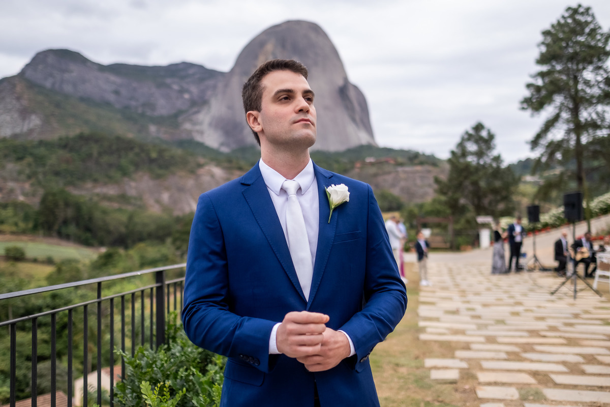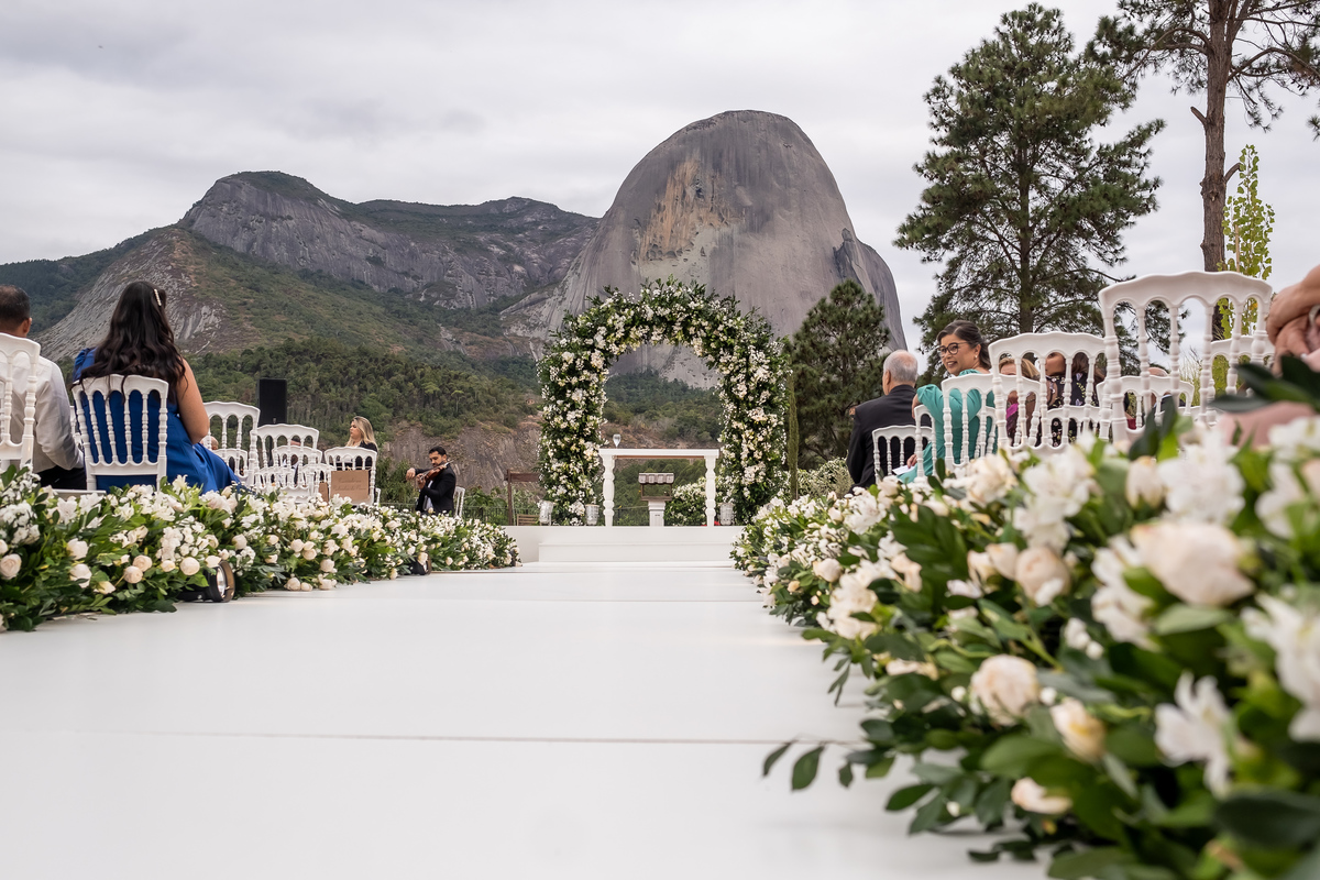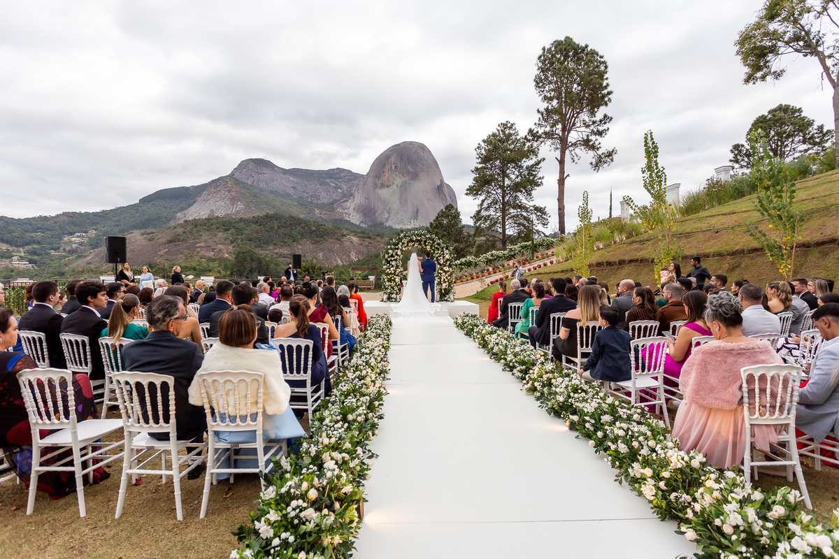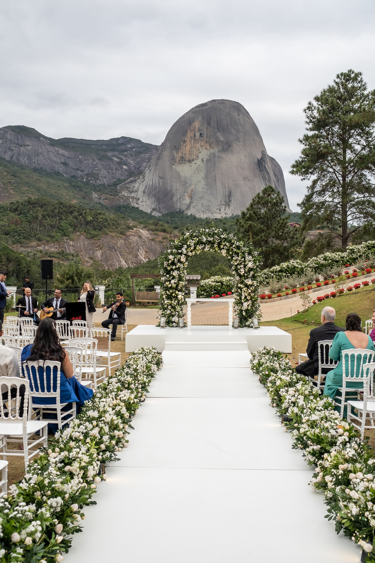 A cerimônia em Pedra Azul, com sua vista para as montanhas e o toque natural envolvente, proporcionou uma atmosfera romântica e acolhedora. O céu nublado apenas acentuou a serenidade do dia, fazendo com que cada momento fosse capturado com uma suavidade e elegância única, tornando o cenário ainda mais especial.