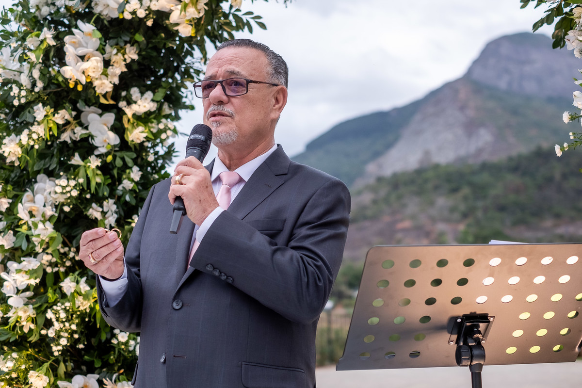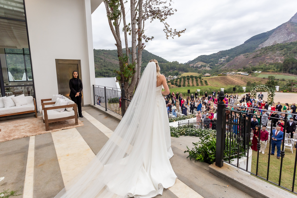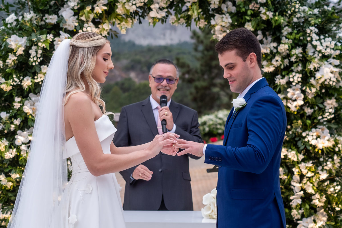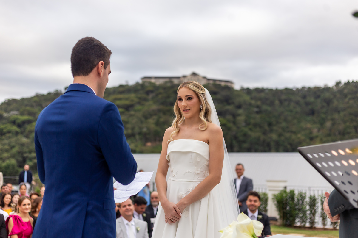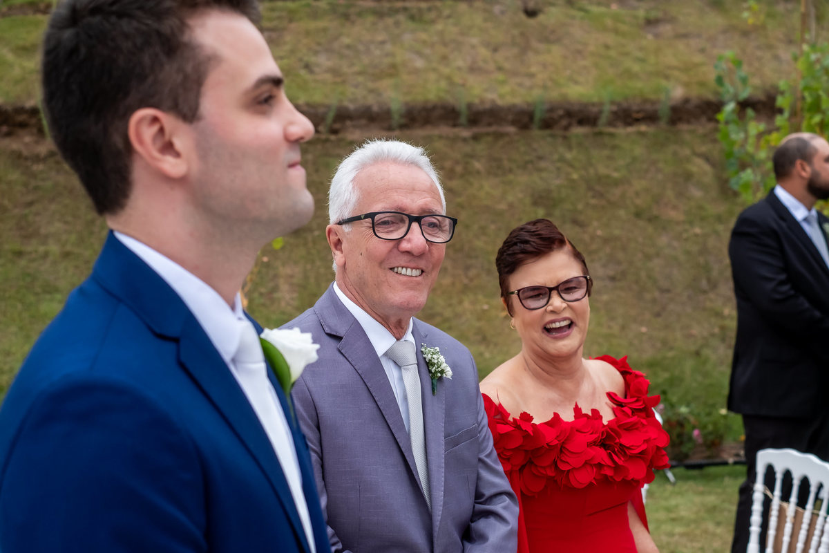 A cerimônia em Pedra Azul, com sua vista para as montanhas e o toque natural envolvente, proporcionou uma atmosfera romântica e acolhedora. O céu nublado apenas acentuou a serenidade do dia, fazendo com que cada momento fosse capturado com uma suavidade e elegância única, tornando o cenário ainda mais especial.
