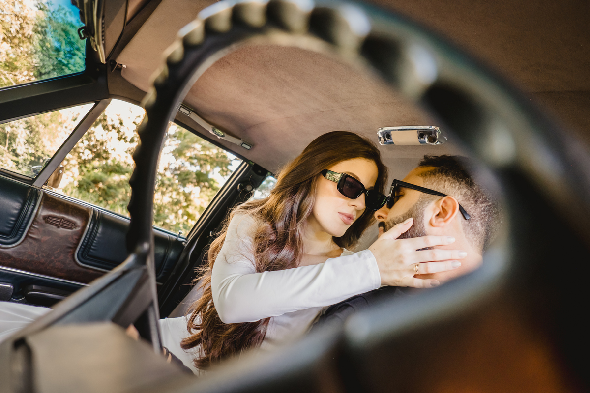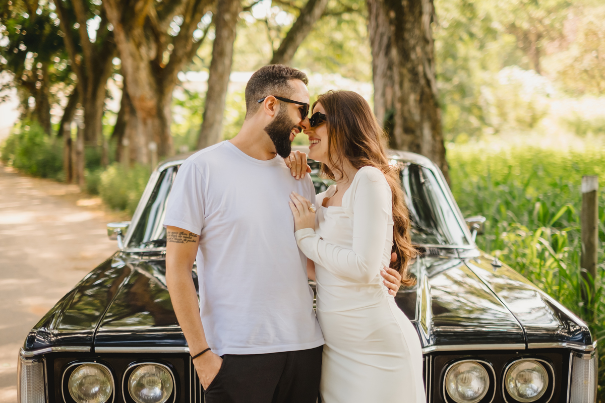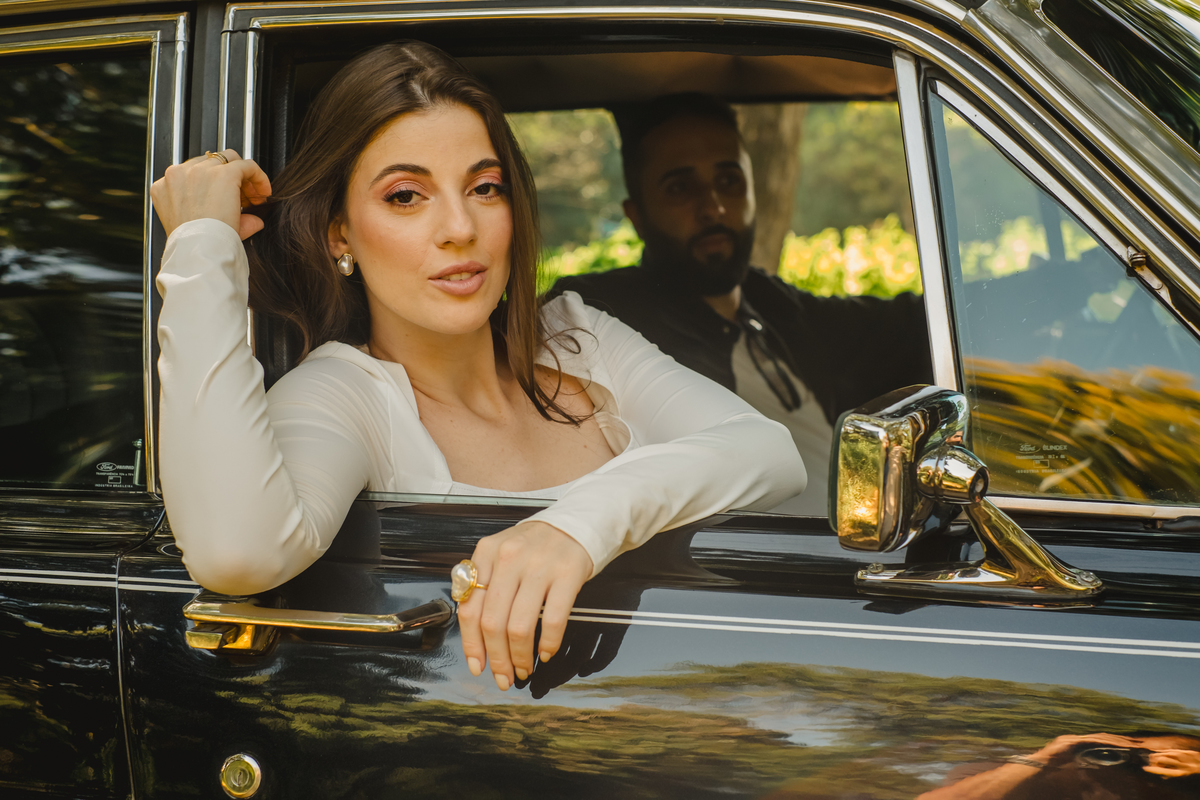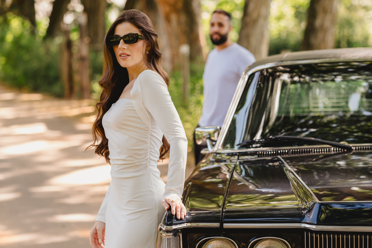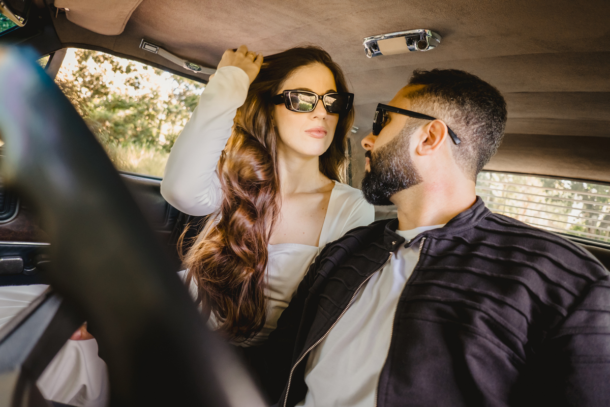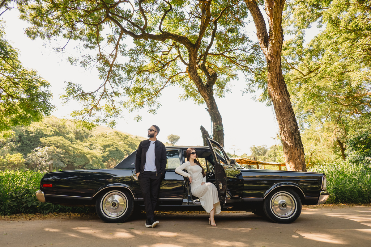 Mas a narrativa pediu um pouco de aventura. A cena mudou para a estrada com a chegada de um clássico: o carro preto trouxe uma textura vintage e uma atitude cinematográfica para as fotos. De óculos escuros e encostados na lataria, eles trouxeram uma vibe editorial de moda, provando que o romantismo também pode ser cheio de estilo.