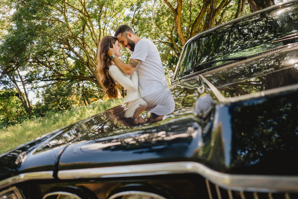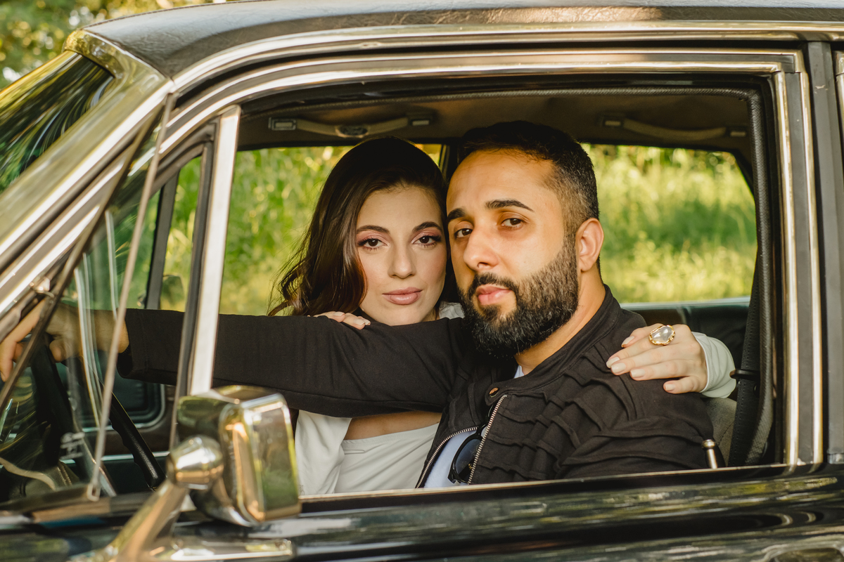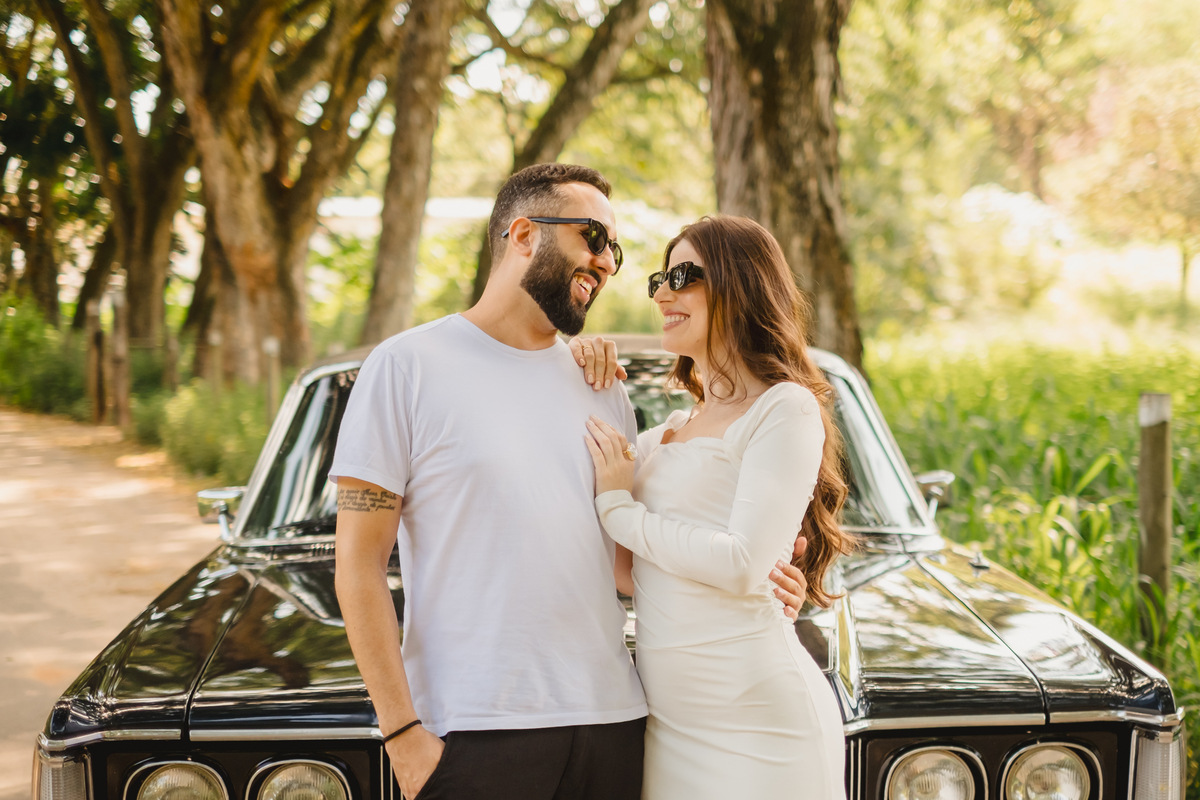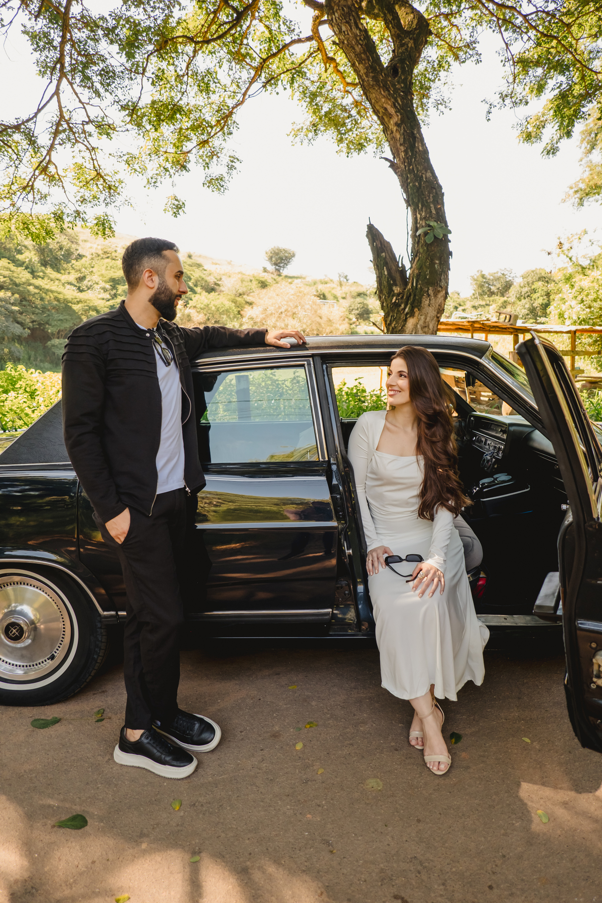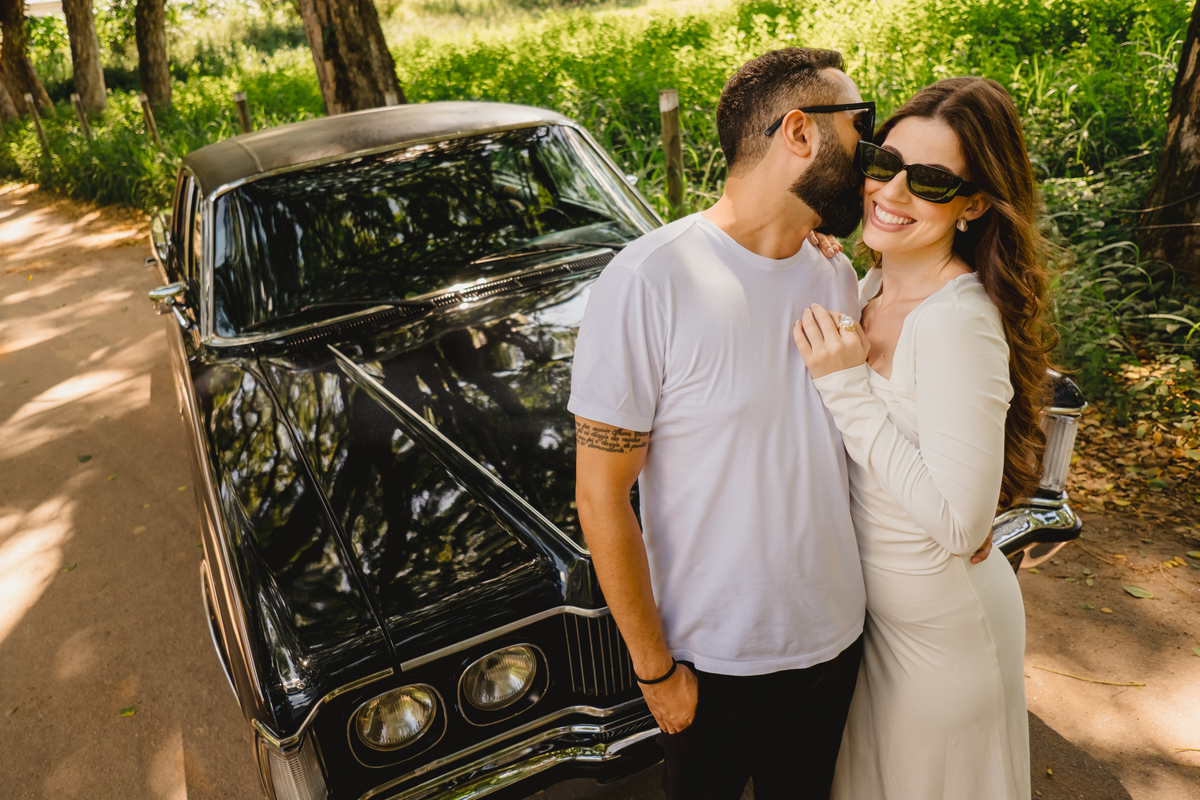 Mas a narrativa pediu um pouco de aventura. A cena mudou para a estrada com a chegada de um clássico: o carro preto trouxe uma textura vintage e uma atitude cinematográfica para as fotos. De óculos escuros e encostados na lataria, eles trouxeram uma vibe editorial de moda, provando que o romantismo também pode ser cheio de estilo.