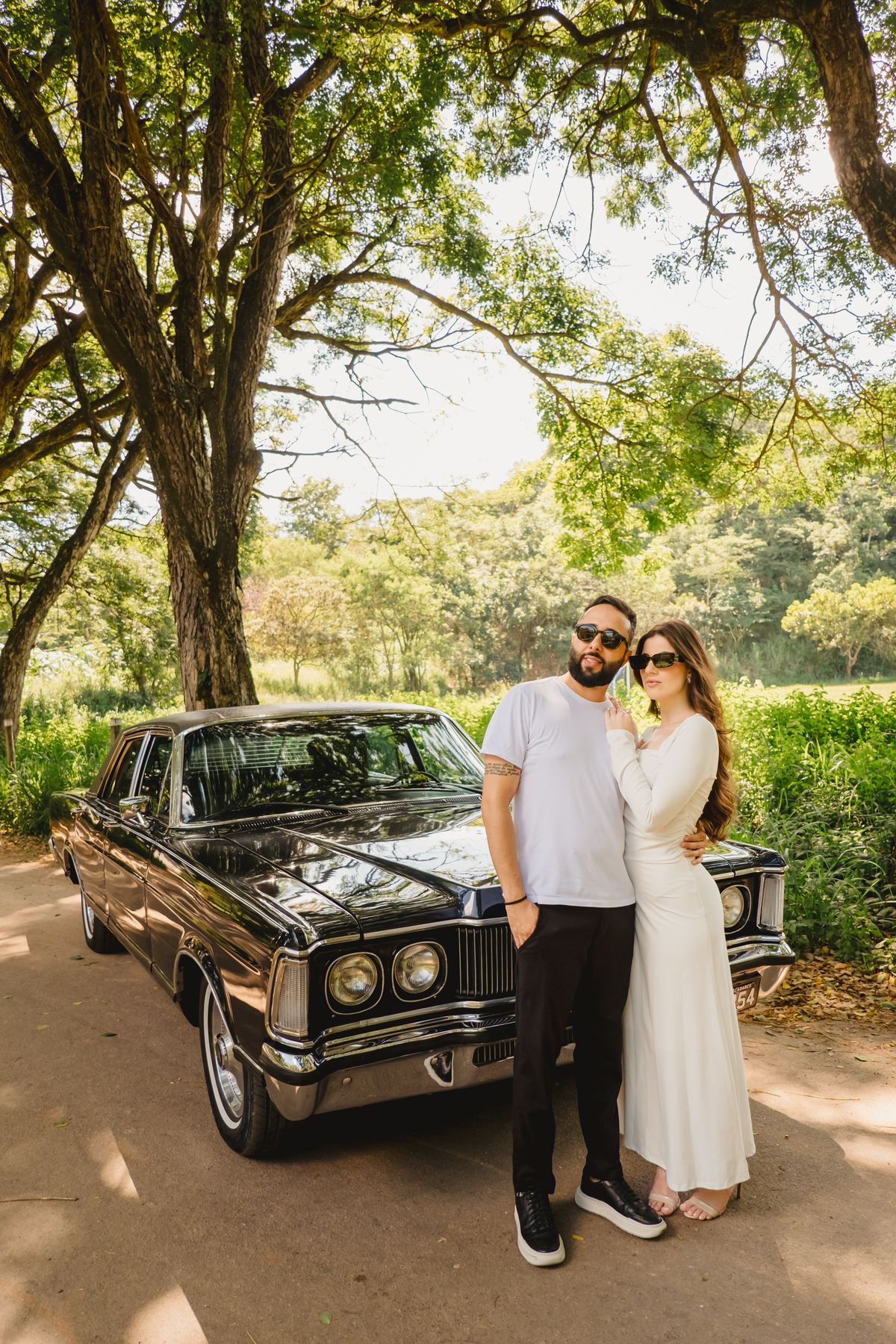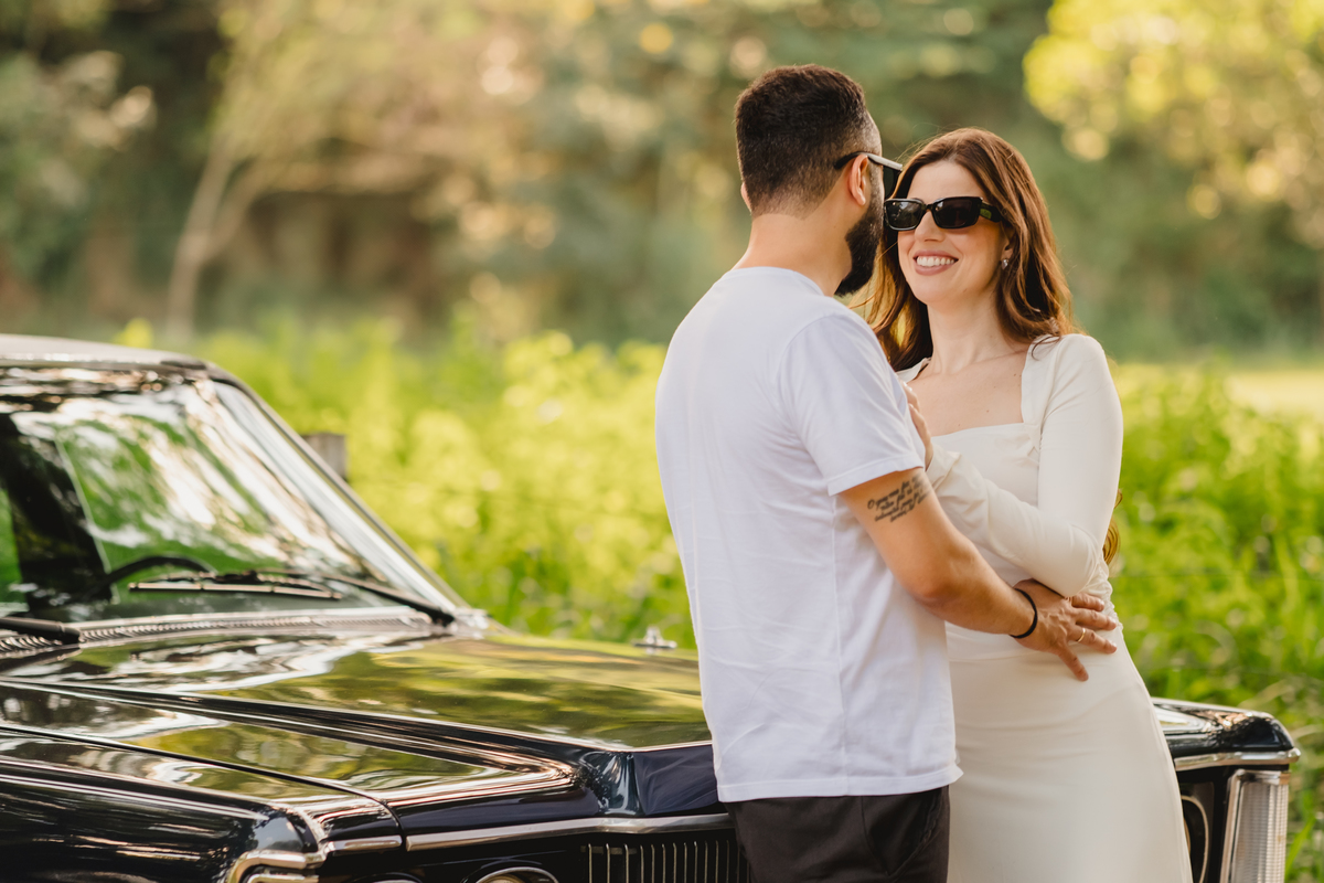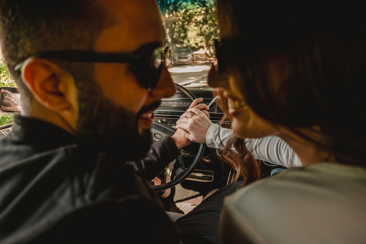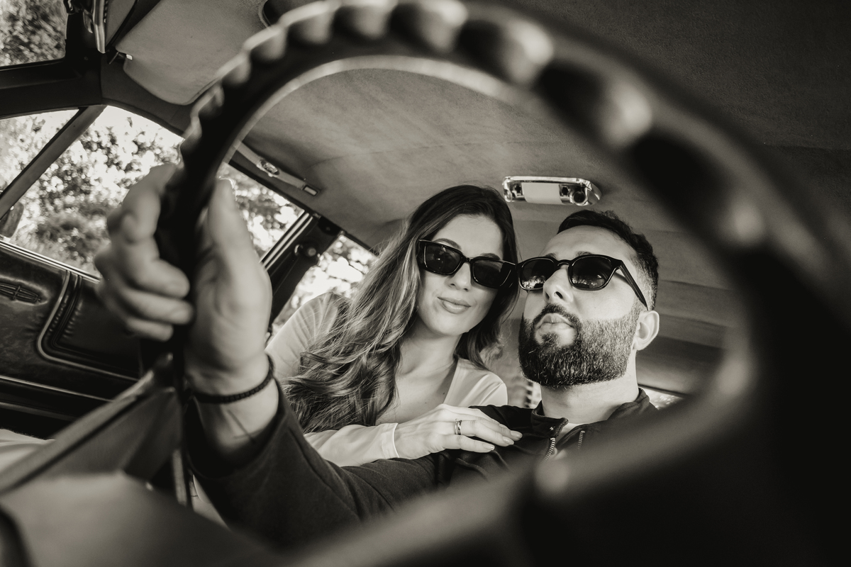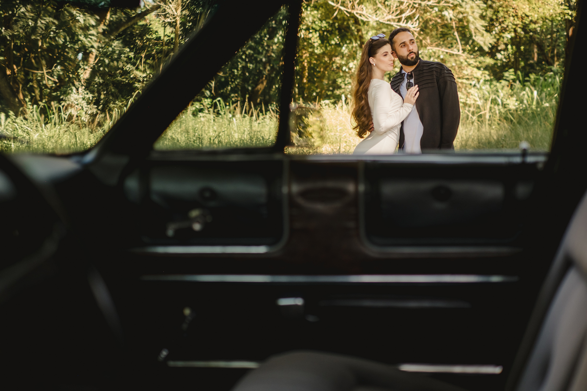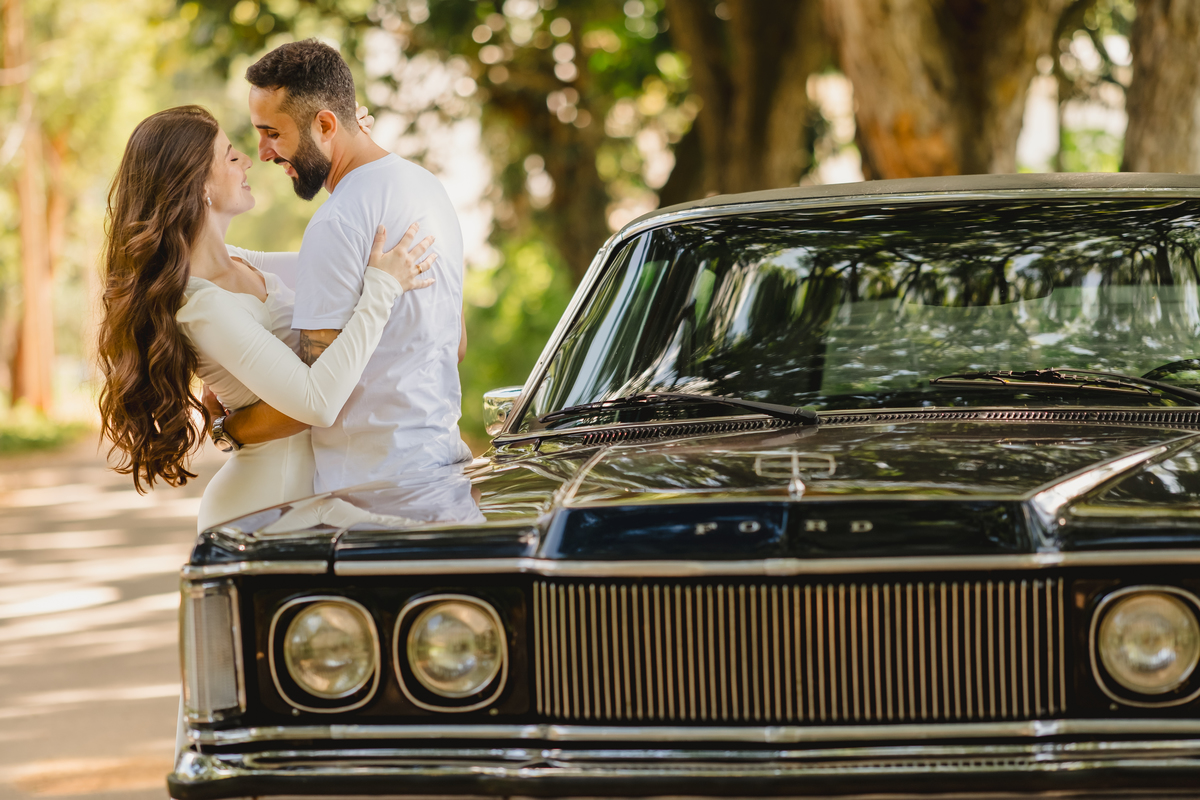 Mas a narrativa pediu um pouco de aventura. A cena mudou para a estrada com a chegada de um clássico: o carro preto trouxe uma textura vintage e uma atitude cinematográfica para as fotos. De óculos escuros e encostados na lataria, eles trouxeram uma vibe editorial de moda, provando que o romantismo também pode ser cheio de estilo.