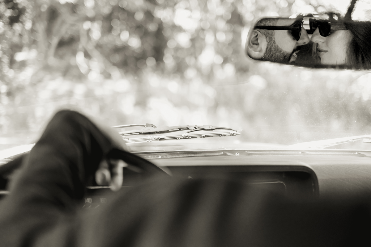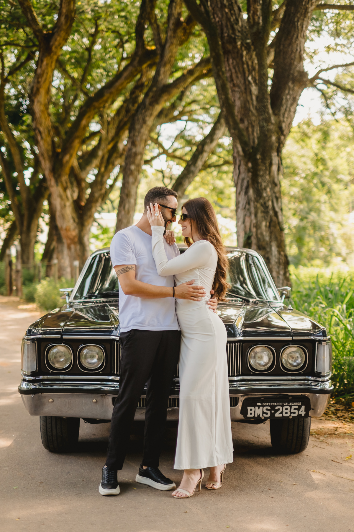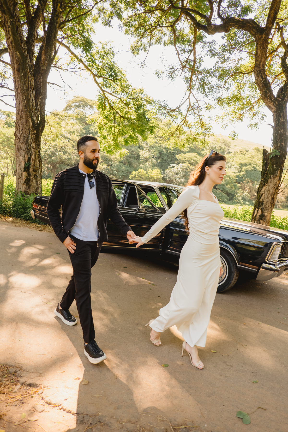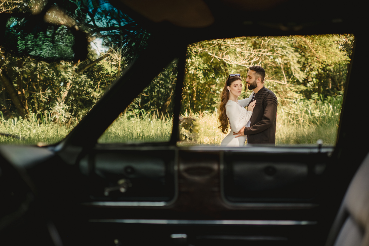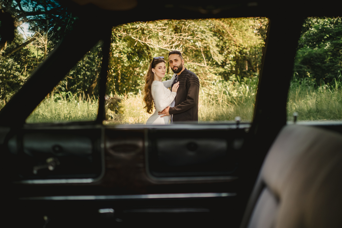 Mas a narrativa pediu um pouco de aventura. A cena mudou para a estrada com a chegada de um clássico: o carro preto trouxe uma textura vintage e uma atitude cinematográfica para as fotos. De óculos escuros e encostados na lataria, eles trouxeram uma vibe editorial de moda, provando que o romantismo também pode ser cheio de estilo.