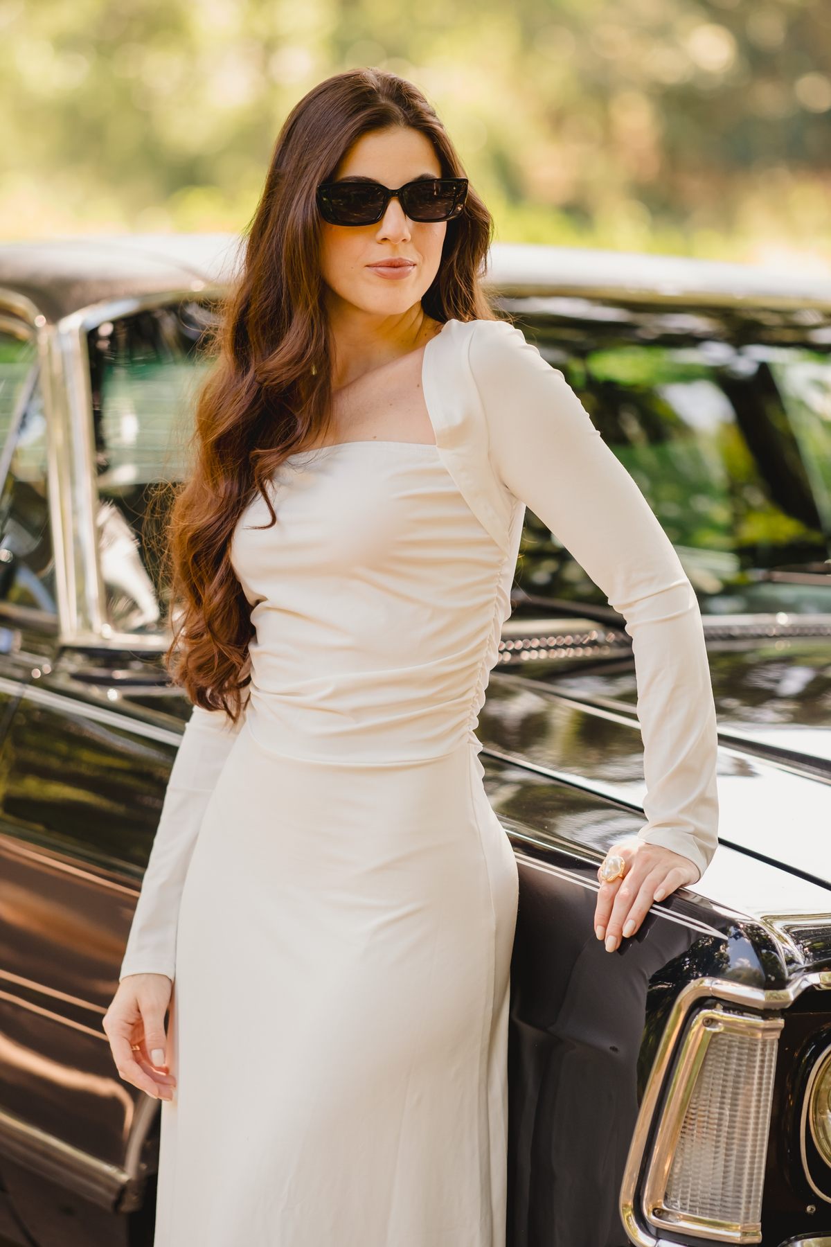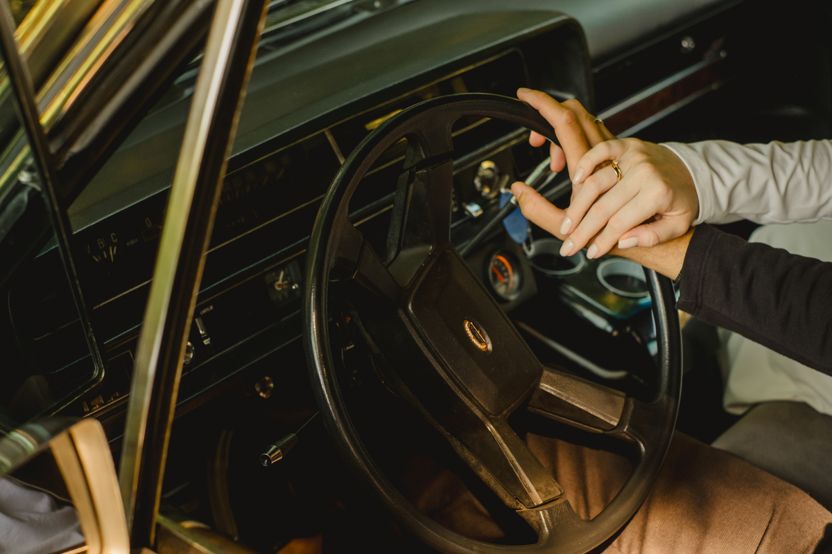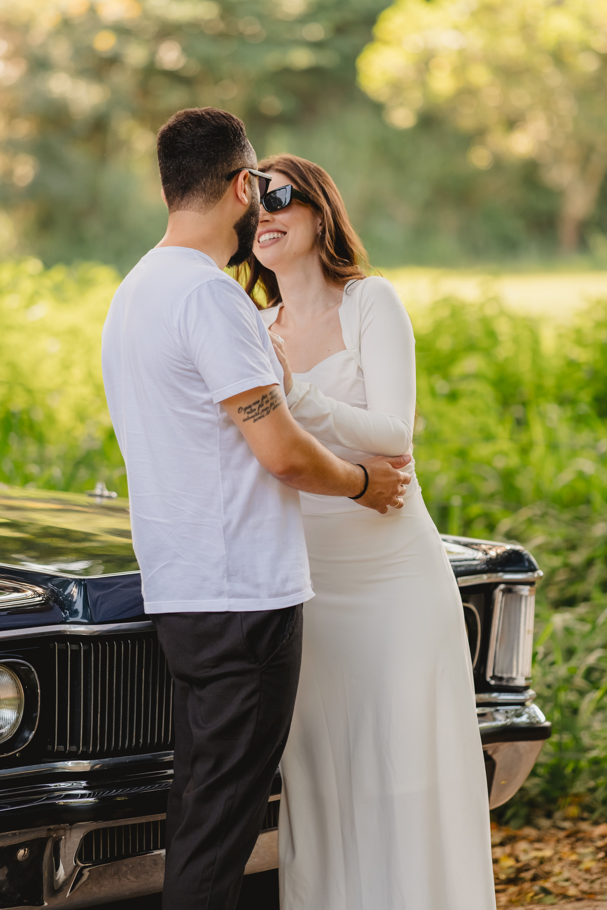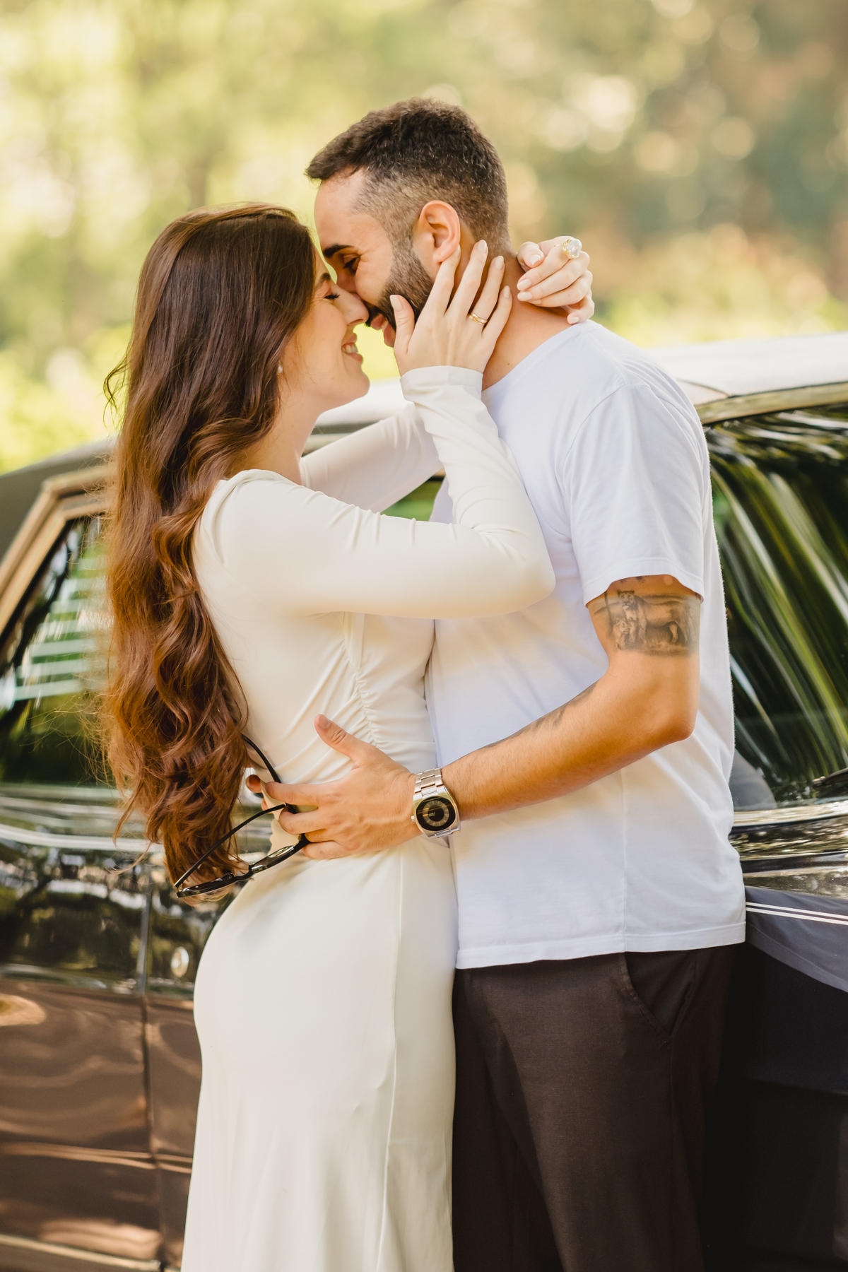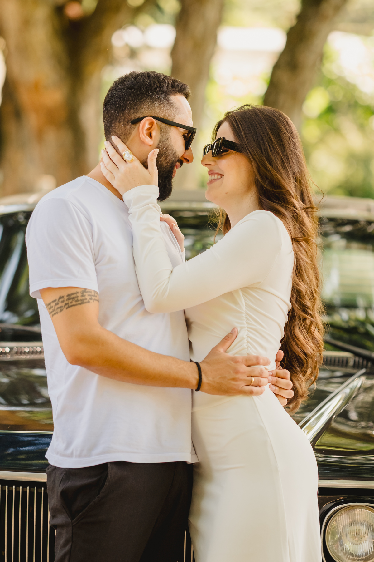 Mas a narrativa pediu um pouco de aventura. A cena mudou para a estrada com a chegada de um clássico: o carro preto trouxe uma textura vintage e uma atitude cinematográfica para as fotos. De óculos escuros e encostados na lataria, eles trouxeram uma vibe editorial de moda, provando que o romantismo também pode ser cheio de estilo.