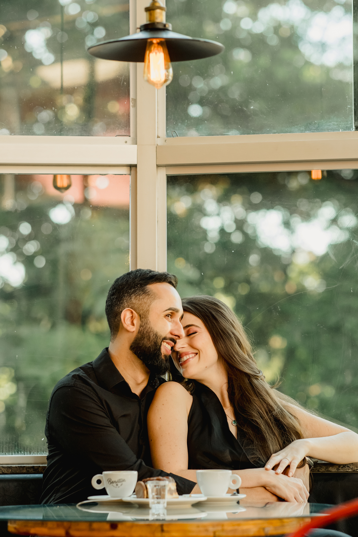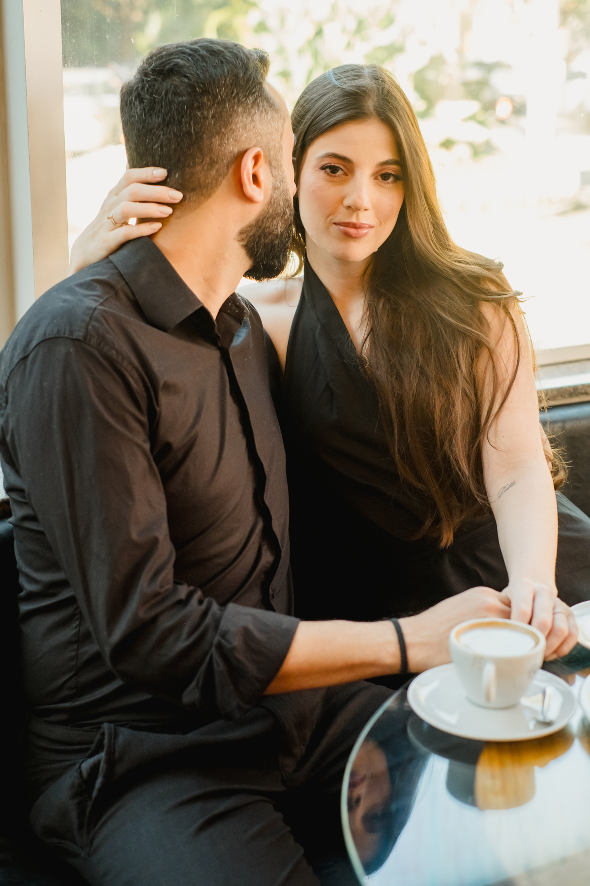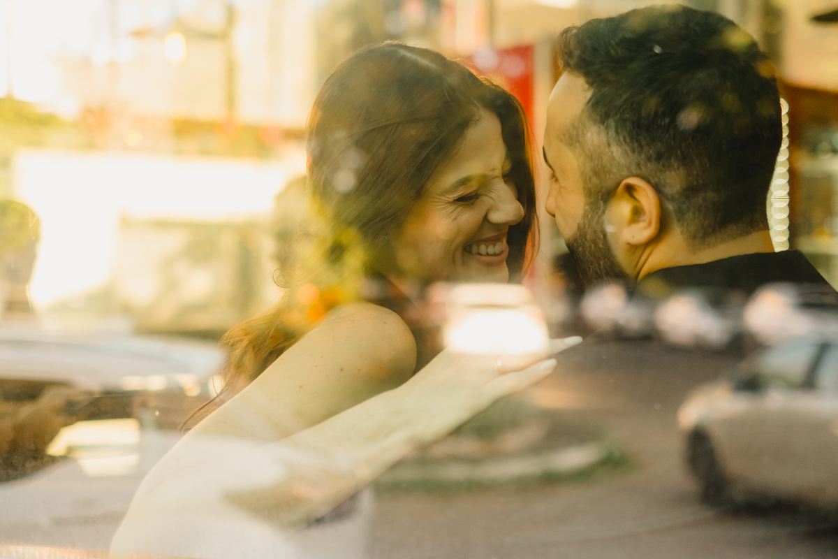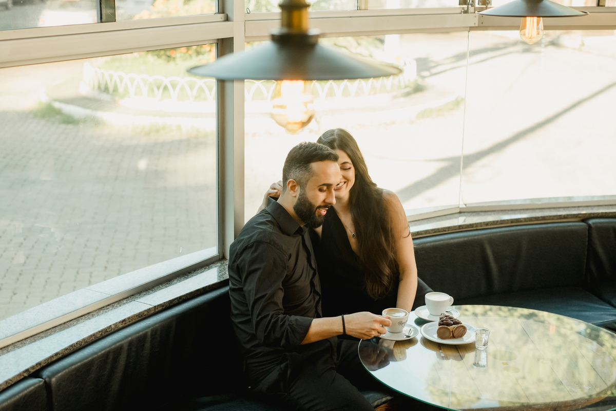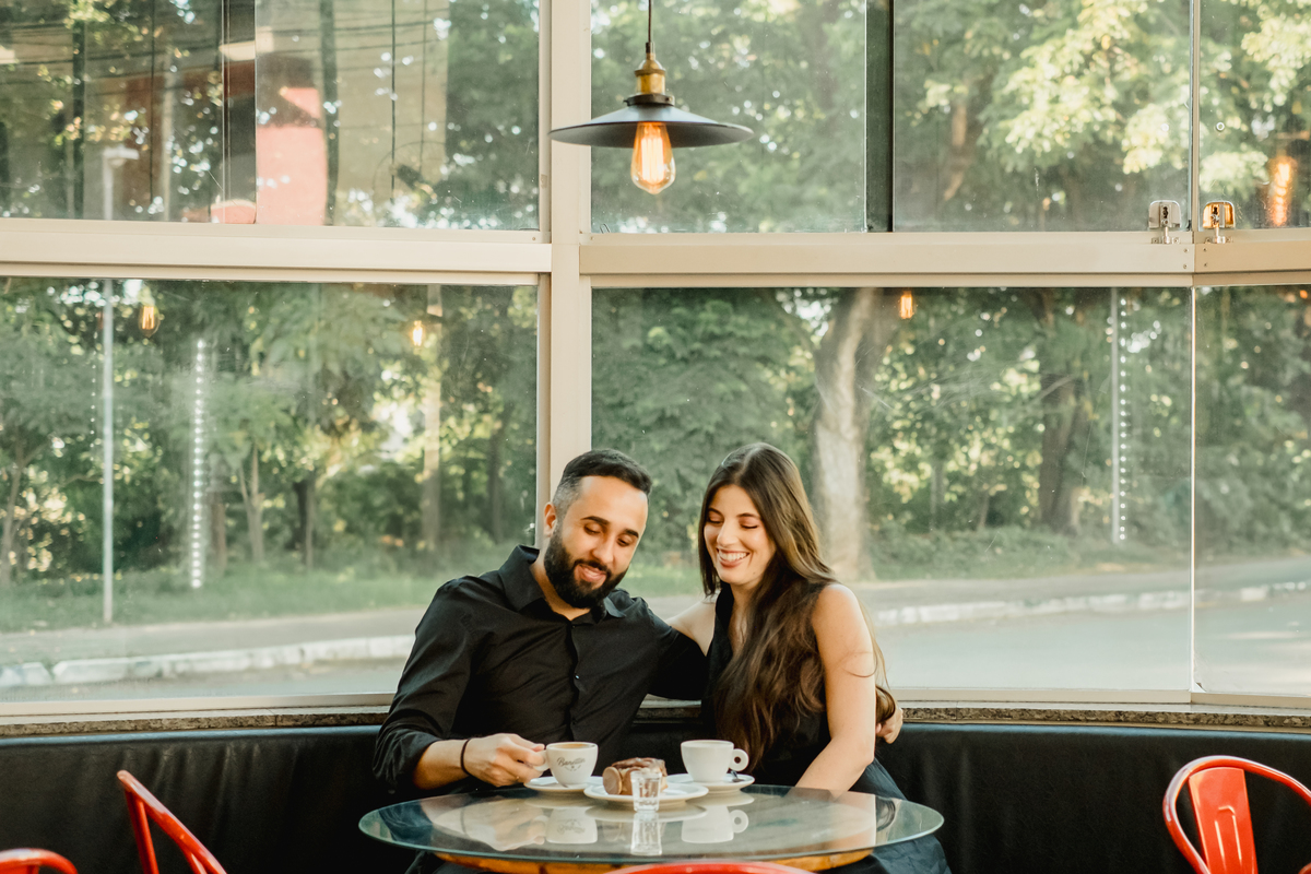 Esqueça as poses rígidas. O ensaio da Giovana e do Hywry foi desenhado como um dia perfeito na vida do casal. Começamos com o clima intimista da cafeteria: aquele momento de dividir uma mesa, trocar olhares de pertinho e deixar o tempo passar devagar. As paredes neutras e a luz de janela criaram o cenário minimalista ideal para destacar o que importa: a conexão deles.